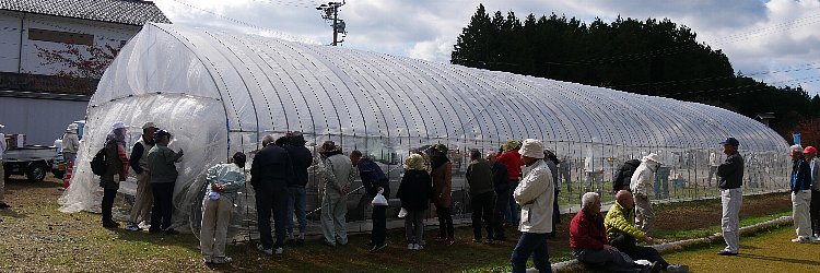 | 巣の取り出しは大きな網室の中で行われる.周りでは多数の見学者が中をのぞき込んで様子を見ている. | |