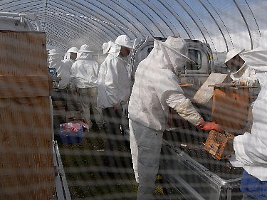 | 巣箱を車ごと大きな網室に持ち込まれ,巣の取り出し作業が行われる. | |