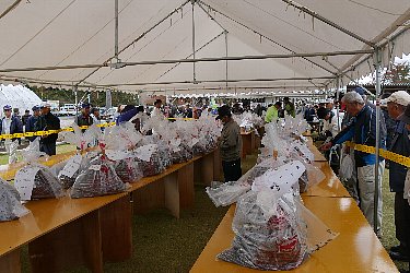 | 計量が終わった巣は大きさ毎に別のテントに並べられ,後で希望者に販売される.右は4Kg台の比較的大きな巣のテーブル. | |