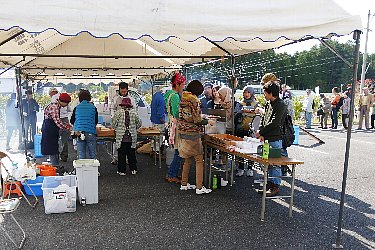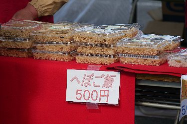| 人気のへぼ五平を買うために行列ができていた.甘いみそだれにすりつぶしたヘボが混ぜ込んであって香ばしい.1本300円也. | |