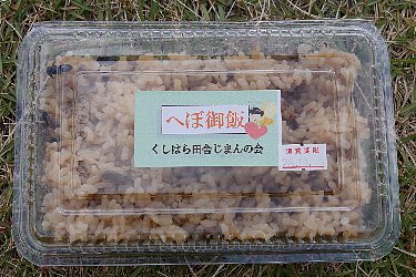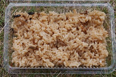 | 定番のへぼご飯.ヘボの幼虫や蛹が混ざった醤油味の炊き込みご飯. | |