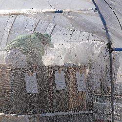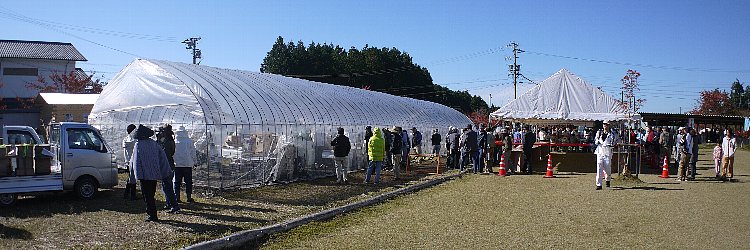| 巣の取り出しを行う大きなビニールハウスと,計量を終えた巣の置き場(右のテント) | ||