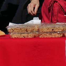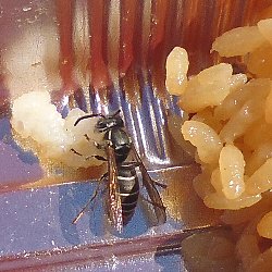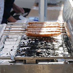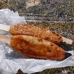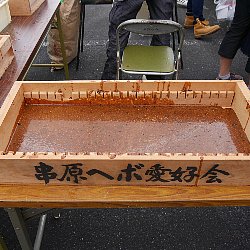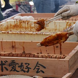 会場で販売されている商品で一番人気があるのはヘボ五平です.五平餅は,炊きあげたうるち米を木の板(棒)に潰して刺し、たれを付けて串焼きにしたものです.地域によって形が異なりますが,串原を始め恵那市ではわらじ型が普通です.お隣の中津川市では団子型が多くなっています.ここで販売されている五平餅は味噌だれで,たれにすりつぶした”ヘボ”が入っており”ヘボ五平”と呼ばれています.会場の名物で,一本300円で販売されており,いつも行列が絶えません. ヘボを御飯に炊き込んだヘボ御飯も人気があります.こちらは1パック500円で販売されていました.醤油味の炊き込み御飯で,中にヘボの幼虫とさなぎが入っています.あまりのおいしさに成虫もやって来て,食べかけの容器に止まっています. |
