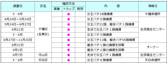 2006年度は従来から実施している市内4定点の他,千種区で保健所を中心に,生活衛生センターおよび東山公園管理事務所の共同で大規模な調査が実施されました.また,天白区でも保健所による調査が実施され,多数の調査地点でチャイロスズメバチが捕獲されました.