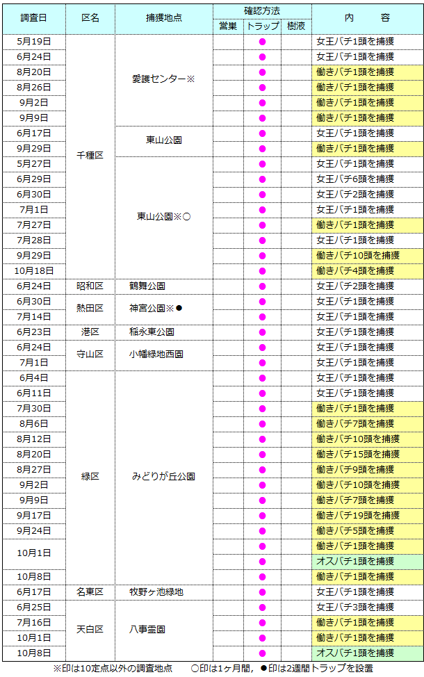 5月19日に誘引トラップで女王バチが1頭捕獲されました.その後も各地で女王バチの捕獲が続き,10定点中7定点で女王バチが捕獲されました.その他の調査地点3地点を合わせると,合計10地点で27頭が捕獲されたことになります. また,7月27日以降,5地点で107頭の働きバチが捕獲されました.このうち85頭は緑区みどりが丘公園に設置したトラップで捕獲されたもので,極めて至近距離に巣があると思われましたが,巣は発見はできませんでした.オスバチは10月に2地点で各1頭が捕獲されました. |