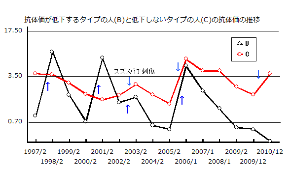 | TOPページ > スズメバチはなぜ刺すか > ハチ刺されと抗体価の変動 | |