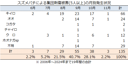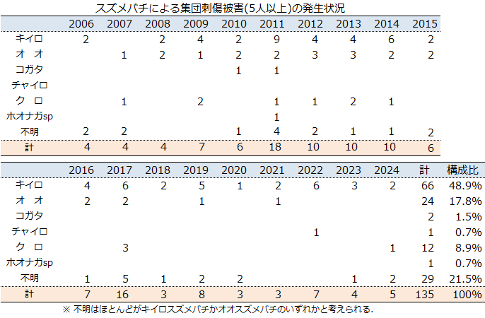 毎年秋口を中心に,スズメバチによる集団刺傷被害が発生しています.被害の原因となったスズメバチの種類は,単にスズメバチと報道されることが多いのですが,営巣場所や被害の状況などから判断すると,そのほとんどがキイロスズメバチかオオスズメバチのいずれかによるものと考えられます.この2種は攻撃性が強く,しばしば刺傷被害が発生しています. 2006〜から2024年までの19年間について,5人以上の刺傷被害が発生した事例を新聞記事などから拾うと135件見つかりました. 最も多いのはキイロスズメバチで,66件,48.9%を占めています.キイロスズメバチは営巣規模も大きく攻撃性も強いため,野外活動の際には細心の注意が必要です.8月以降は営巣活動が最盛期を迎えて巣の規模も大きくなり,被害が多発しています.また,オオスズメバチの襲撃に対して警戒態勢に入っており,付近を大勢で通行するだけで突然攻撃してくることがあります. 次いで多いのはオオスズメバチで,24件,17.8%を占めています.オオスズメバチは土中や樹洞などの低い場所に営巣するため,多人数で通行した際の振動が巣に伝わり,攻撃してくることが多いためと考えられます. また,比較的攻撃性が弱いとされるクロスズメバチによる被害が12件発生していることは,大変興味深いものがあります.これは営巣場所が土中であり,成虫も小型で目立ちにくいため,知らずに巣の上を通過するなど,直接刺激与えたため被害が発生したものと考えられます. 被害は6月〜11月までの6ヶ月間に発生していますが,特に多いのは8〜10月の3ヶ月間で,122件,90.3%がこの時期に発生しています.9月が55件,40.7%を占め,次いで10月が38件,28.1%,8月が29件,21.5%の順となっています.秋になり野外活動の機会が増加するとともに,刺傷被害も多発するようになります. 被害の規模はキイロスズメバチが最も被害人数が多く,10人以上が被害に遭うケースも少なくありません.50人以上,時には100人を越える被害が発生することもあります.同じく被害の発生が多いオオスズメバチの場合は,キイロスズメバチと異なり,ほとんどが20人以下となっています. |