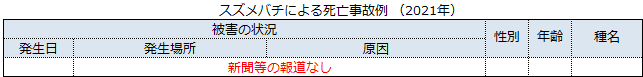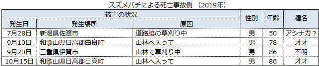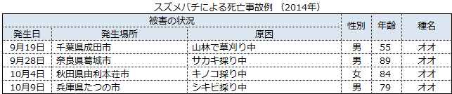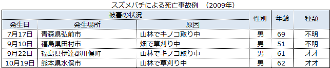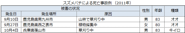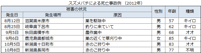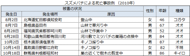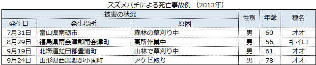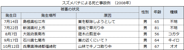 | TOPページ > スズメバチによる刺傷被害 > ハチ刺されと死亡事故 > スズメバチ死亡事故一覧 | |