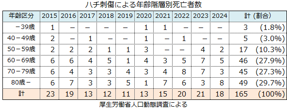 ハチに刺されたことが原因で死亡した人の数は,厚生労働省の人口動態調査の結果で知ることができます.ハチ刺傷に関する項目は1979年に統計が始まりました.死亡者数の大部分がスズメバチによるものと考えられますが,一部アシナガバチ等によるものも含まれています.毎年9月に前年分の集計結果が公表されますが,2024年分の統計結果が,2025年9月16日に公表されました. ハチ刺傷による死亡者は18人で,前年の21人から3人減少しました.男女別の内訳は男性12人,女性6人となっています.最も死亡者が多かった1984年には,全国で73人が亡くなっていますが,最近は毎年20人前後となっています. 男女の割合は男性が多く,1979年〜2024年まで46年間の総死亡者数1,225人の内訳をみても,男性978人,79.8%人に対して女性247人,20.2%と男性が圧倒的に多くなっています. 2015〜2024年まで10年間の死亡者数を年齢階層別にみると,80歳以上が49人,29.3%を占めて最も多くなっています.以下,60歳代46人,29.7%,70歳代45人,27.3%,50歳代が17人,10.3%の順となっており,圧倒的に高齢者が多いという特徴があります. |