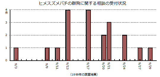 2000年頃から,スズメバチが高層マンション等の最上階周辺を集団で飛び回り,住民に恐怖心を与えるという事例が目立つようになりました.時には網戸やガラス戸に当たったり,壁に止まったりする他,窓が開いていると室内に侵入してくることもあり問題となっています. ヒメスズメバチが多発した1999年には,名古屋市内で9月3〜29日までの約1ヶ月間に20件の相談が寄せられました.2000年,2001年にも少数ですが相談が寄せられています.相談は最上階の住民からが大部分を占めています.また,メールでも全国から同じような相談や情報の提供がありました.これはヒメスズメバチの交尾行動によるもので,オスバチが集団で飛び回っているところへ新女王が飛来し,交尾することが明らかになりました(新女王の飛来と交尾が目撃されています). 飛来したオスバチは,建物の中程から最上階にかけて,建物に沿って飛び回り,時々屋上に上がってきては,また下に下りて周辺を飛び回るという行動を繰り返します.そのため”屋上に巣があるのではないか”という苦情が寄せられることが多く,管理会社や保健所の職員が屋上を調査したものの巣が見つからなかったケースも少なくありません.また同一方向から飛来するため,”近くの雑木林に巣があるのではないか”などと住民から指摘されたケースもあります. |