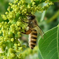 中国原産の帰化植物で,街路樹や公園などによく植えられています.6月〜7月に房状の小さな花を咲かせ,ハゼノキと同じようにロウを取ることができます.花は雄花と雌花に分かれており,どちらが先に咲くかは株によって異なっています.秋には美しく紅葉し,また冬になると種子が割れて中から白い種子が出てきます. ハチを始めチョウなどもよく吸蜜にやってきます.開花時期が,スズメバチの本格的な活動期よりも少し早いため,訪花する個体は多くありませんが,狩り場を兼ねて飛来する個体が見られます. |
