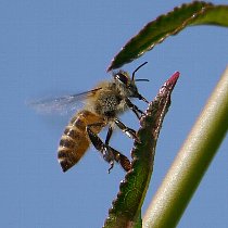 モッコウバラは中国原産の園芸品種で,枝に棘がないため扱いやすく,庭木としてよく植えられています.開花時期は4月から5月で,黄色や白色の花を咲かせます. 花には昆虫は訪花しませんが,新しく伸びた新芽にある蜜外蜜腺にはいろいろなハチが好んで蜜をなめにやって来ます. |