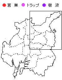 名古屋市では,1992年から2005年までの14年間に5件の営巣確認と4件の捕獲記録があります.営巣が確認されたのは千種区および名東区で,いずれも相互に数百m程度しか離れておらず,特定の地域に極めて集中的に分布しています. 成虫が確認されたのは千種区内で2件,守山区内で2件あります.守山区内の採集場所は本種が集中的に確認されている地域からは北に7Km程離れており,別の巣に由来する個体と考えられます. 2000年以降は毎年どこかで生息が確認されており,本市の北東部丘陵地に少なからず生息していることは間違いありません.これらの地域はモンスズメバチの営巣が極めて多く,いずれの巣もモンスズメバチを乗っ取ったものと考えられます. |