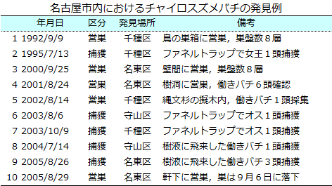 | TOPページ > 名古屋のチャイロスズメバチ > 2005年以前の概況 |