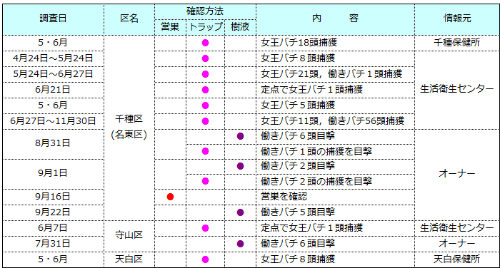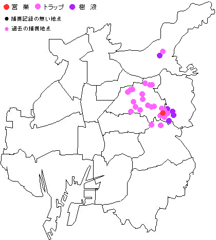 名古屋市では,1992年から2005年までの14年間に5件の営巣と4件の捕獲の記録がありました.2006年には1ヶ所で営巣が確認された他,多数のトラップや樹液で成虫が捕獲,確認されています.見つかったのは従来から生息が確認されている千種区,名東区の他,これに隣接する天白区で初めてトラップで捕獲されました.また守山区で2年振りにトラップでの捕獲と,樹液に飛来した働きバチを確認しました.市内各地で多数の個体が同時に確認されたのは初めてのことで,2006年はチャイロスズメバチの当たり年であったと言えます. |