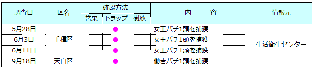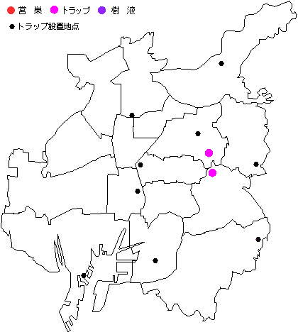 2008年は千種区東山公園と天白区の2地点のトラップで3頭の女王バチと1頭の働きバチが捕獲されましたが,営巣は確認できませんでした.昨年と較べると大幅に捕獲数は減少しましたが,9月に天白区で働きバチが1頭捕獲されたことから,本年も市内に営巣していることは確実です.