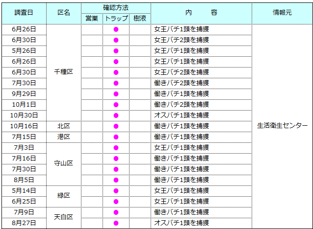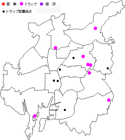 2009年は,営巣の発見やや樹液に飛来する個体の目撃はありませんでしたが,市内各地に設置したトラップで女王バチ11頭,オスバチ1頭,働きバチ11頭の合計23頭が捕獲されました.千種区,北区,港区,守山区.天白区でオスバチや働きバチが捕獲されたことから,市内各地に営巣していると思われますが,巣は残念ながら発見できませんでした.