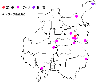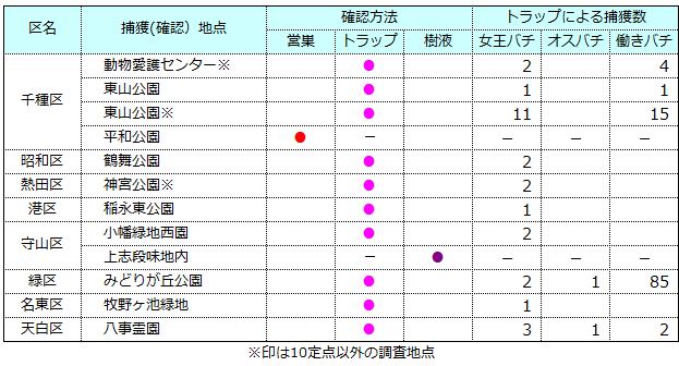 5月19日に誘引トラップで女王バチ1頭が捕獲されて以降各地で捕獲が続き,過去最高の136頭を捕獲しました.内訳は女王バチ27頭,オスバチ2頭,働きバチ107頭となっています. また、千種区の動物愛護センター,東山公園,天白区の八事霊園に設置したトラップでも,働きバチとオスバチが散発的に捕獲されたことから,付近での営巣が考えられましたが,こちらも巣の発見には至りませんでした.その他では,守山区上志段味地内の樹液で目撃情報が寄せられました. |