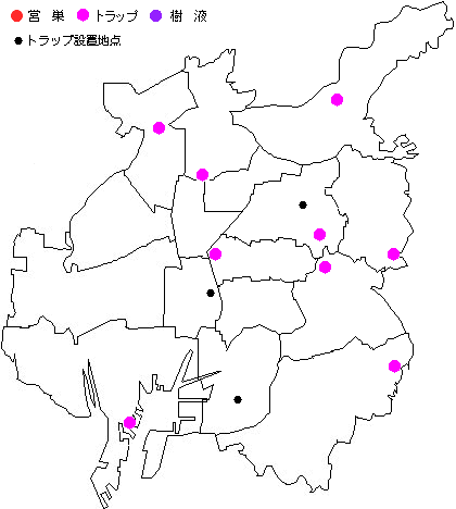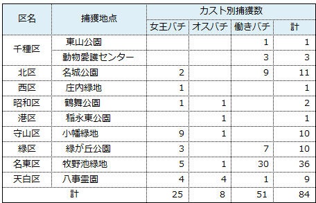 営巣や樹液での確認はありませんでしたが,10カ所のトラップで女王バチ25頭,オスバチ8頭,働きバチ51頭の合計84頭が捕獲されまし.2010年に136頭が捕獲されて以降,久し振りに多数の個体が捕獲されました.