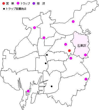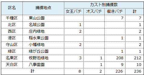 千種区の東山公園で,8月に1件の駆除情報がありますが詳細は不明です.また名東区内の樹液ではチャイロスズメバチが多く見られるという情報がItokenさんより寄せられています. トラップ調査では,8カ所のトラップで女王バチ8頭,オスバチ2頭,働きバチ226頭の合計236頭が捕獲されています.名東区の牧野池緑地では,働きバチが7月〜9月にかけて208頭捕獲されており,トラップに極めて近い場所に営巣していた可能性が高いと思います. |