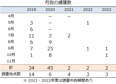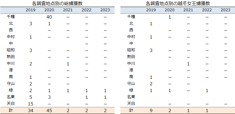 トラップ調査は,2019年14地点,2020年6地点(但し,調査期間は7月〜),2021年4地点で実施しました. 2019年の調査では14地点中9地点のトラップで34頭(内訳:女王バチ9頭,オスバチ7頭,働きバチ18頭)が捕獲されました. 2020年の調査では,6地点中4地点のトラップで45頭(内訳:女王バチ2頭,オスバチ1頭,働きバチ42頭)が捕獲されました. 2021年の調査では,4地点中2地点のトラップで2頭(内訳:女王バチ1頭,オスバチ1頭)が捕獲されました. 2022年の調査では,3地点中2地点のトラップで2頭(内訳:女王バチ1頭,オスバチ1頭)が捕獲されました. 2023年の調査では,3地点中2地点のトラップでオスバチ2頭が捕獲されました. |