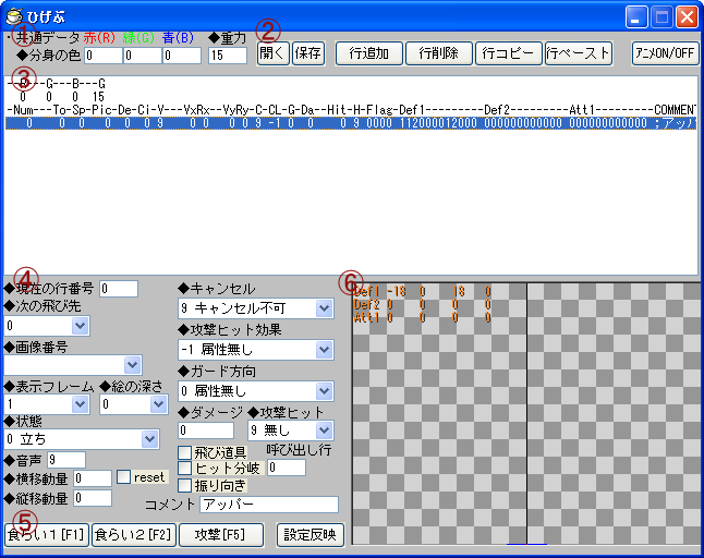 1を指定しておき、攻撃判定、ガード方向、そしてヒット効果の全てを指定することで
