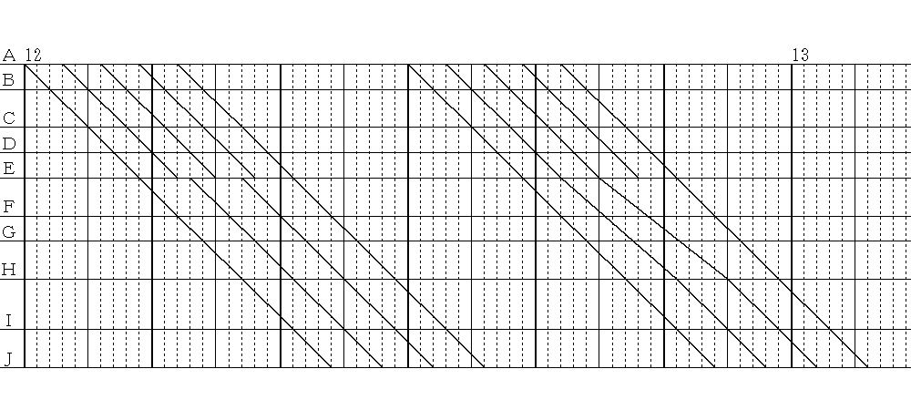 下記の図のような駅があり、A駅〜E駅は3分間隔、E駅〜J駅は4分間隔で走らせるとすると、3分と4分の最小公倍数である12分サイクルで考える。
